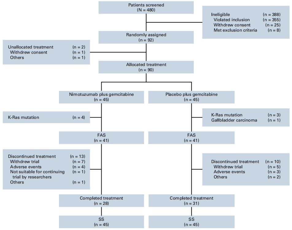 图1. 试验设计流程图 (FAS 全分析集;gem 吉西他滨;SS 安全集)(引自Journal of Clinical Oncology)