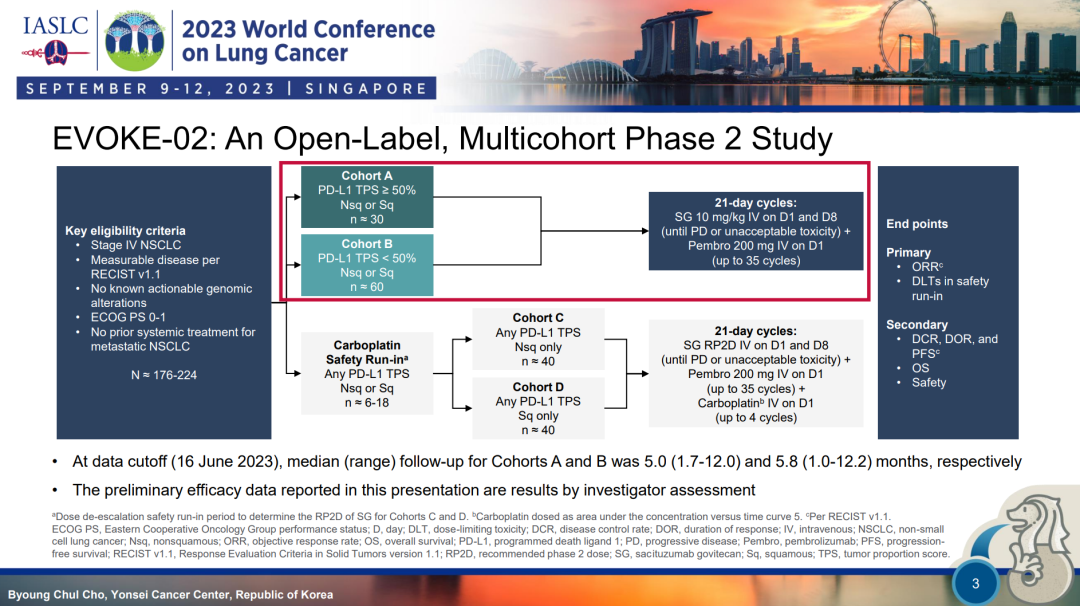 陆舜教授:EVOKE-02研究是一项全球、开放性、多队列Ⅱ期研究,旨在评估戈沙妥珠单抗+帕博利珠单抗±铂类在无可靶向基因改变的转移性NSCLC初治患者的疗效和安全性。该研究设计了4个队列:队列A为PD-L1肿瘤比例评分(TPS)≥50%的鳞癌或非鳞癌患者,队列B为PD-L1 TPS<50%的鳞癌或非鳞癌患者,此两组患者予以SG(10 mg/kg,d1、d8)+帕博利珠单抗(200 mg,d1),21天为1周期。队列C则不考虑PD-L1 TPS,只针对非鳞癌,队列D同样不考虑PD-L1 TPS,只针对鳞癌患者,队列C与队列D予以SG(Ⅱ期研究推荐剂量,d1、d8)+帕博利珠单抗(200 mg,d1)+卡铂(AUC 5,d1),21天为1周期。主要研究终点包括ORR、安全性导入阶段的剂量限制性毒性(DLT),次要研究终点包括DCR、缓解持续时间(DoR)、无进展生存期(PFS)、总生存期(OS)和安全性。