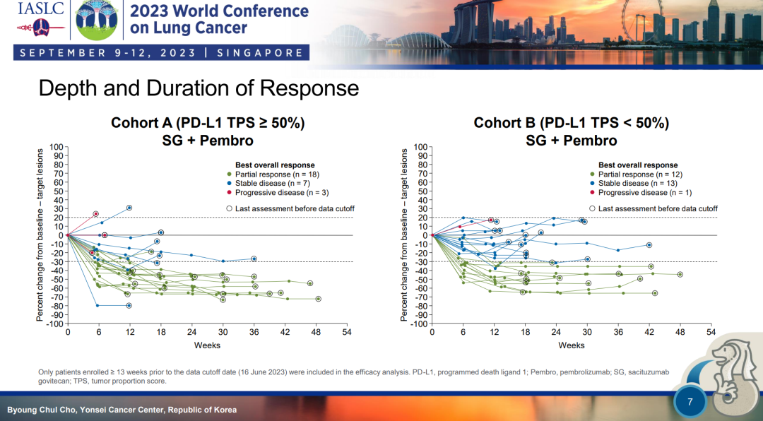 本次WCLC大会则主要针对队列A和队列B接的初步结果予以揭示,显示对两组总体患者群使用SG+帕博利珠单抗的ORR可达56%,6个月DoR率为87%,总体而言在疗效上取得了一定进展。该研究是Trop-2 ADC SG首次与帕博利珠单抗联合用于NSCLC的一线治疗,并根据NSCLC的PD-L1 TPS评分与组织学分类进行了分层,在研究设计阶段就反映了研究者遴选优势人群的想法,具有很强的借鉴意义。目前我们正在进行一项SG+帕博利珠单抗对比帕博利珠单抗单药用于NSCLC一线治疗的EVOKE-03研究,此项Ⅲ期临床研究主要针对PD-L1高表达NSCLC人群展开探索,目前正在进行中。期待EVOKE-02、03两项研究均能够取得良好的结果,为进一步提升一线治疗疗效添砖加瓦。