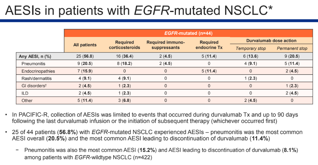部分EGFR突变NSCLC患者发生了特别关注的AE(AESI,56.8%),这些AE仅限于度伐利尤单抗治疗期间以及最后一次输注或开始后续治疗的90天内发生的AE,仅11.4%的AESI导致度伐利尤单抗停用。EGFR突变患者发生的不良反应(AE)主要包括肺炎(9例,20.5%)、内分泌疾病(7例,15.9%)、皮疹/皮炎(4例,9.1%)、胃肠道疾病(2例,4.5%)和间质性肺疾病(ILD)(2例4.5%)等。