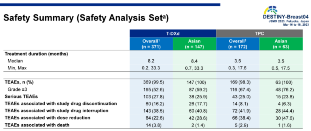 在安全性方面,亚洲患者接受化疗的≥3级治疗期间出现的不良事件(TEAEs)、导致治疗减量的TEAEs发生率均高于全球,这与亚洲人群的化疗耐受性差于欧美人群是一致的。而T-DXd组的TEAEs发生率或治疗耐受性,整体上与全球患者一致。亚洲患者接受T-DXd治疗的≥3级TEAEs(59.%vs 76.2%)、导致治疗减量的TEAEs(28.6%vs 47.6%)发生率低于化疗组。此外,亚洲患者的间质性肺病(ILD)/非感染性肺炎事件发生率与全球患者一致(14.3%vs 12.1%),而且大多为1-2级事件,仅有1例3级事件,没有4-5级事件。日本患者的ILD/非感染性肺炎事件率略高(26.8%),但均为1-2级事件,属于临床可管理、可控制事件。
