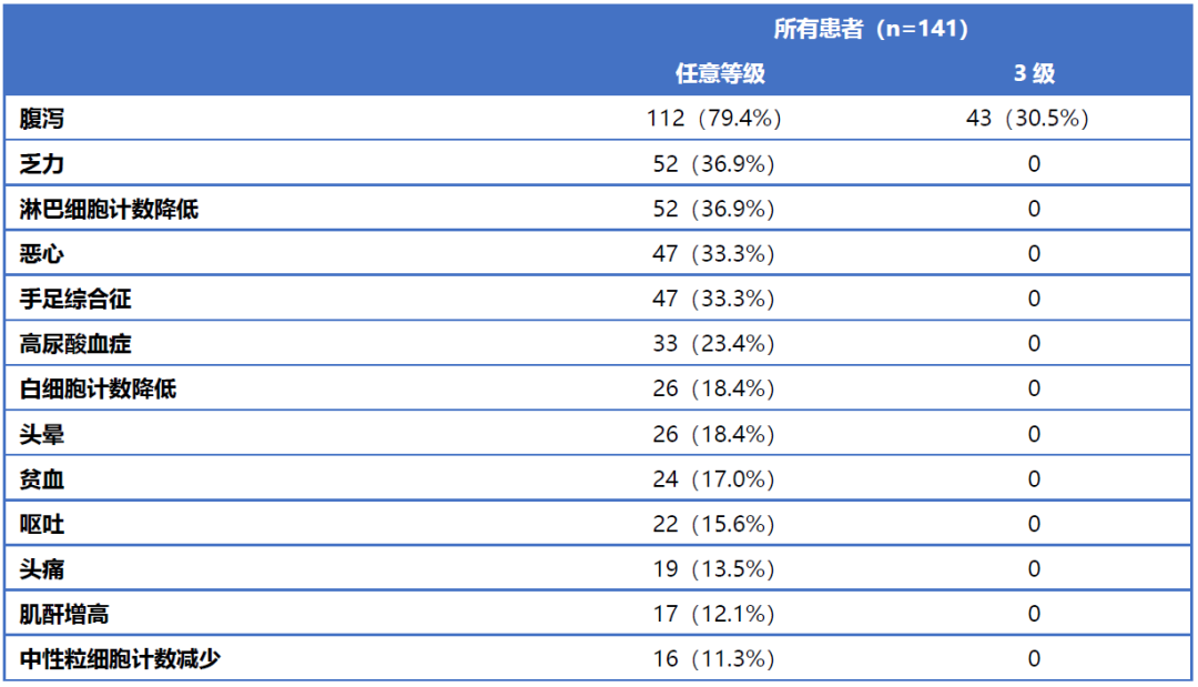 最常见的不良事件为腹泻(79.4%),其中43名患者(30.5%)发生了3级腹泻。其他常见不良事件为乏力(36.9%)、淋巴细胞计数降低(36.9%)、恶心(33.3%)、手足综合征(33.3%)等,没有发生4级及以上的不良事件。12名患者(8.5%)因不良事件导致停药(表2)。
