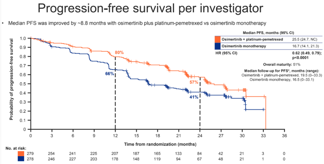 与任何组合一样,这种联合方案的问题在于早期采用强化治疗与按需序贯用药相比是否有优势。我认为,如果PFS方面有巨大获益,而OS结果尚不成熟,但显示出明显的OS获益趋势,使用这种有质疑的方案,并假设随着更长时间的随访OS获益将变得显著,这种思路是合适的。毕竟,在III期不可切除NSCLC患者中开展的PACIFIC试验中,以及奥希替尼对比第一代EGFR TKI治疗EGFR阳性晚期NSCLC患者的FLAURA试验中,我们最终看到了这种现象。