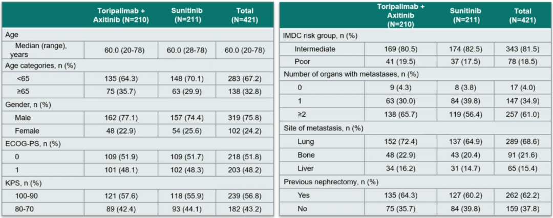 结果:共纳入421例患者,特瑞普利单抗组210例,舒尼替尼组211例。基线特征如下图所示,IMDC中危患者占81.5%,高危患者占18.5%。