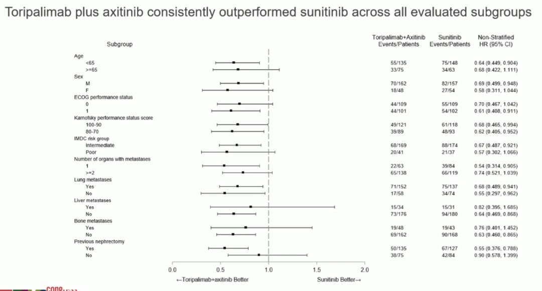 结论:在未经治疗的晚期中高危肾癌患者中,与舒尼替尼相比,特瑞普利单抗合阿昔替尼治疗具有显著更长的PFS和更高的ORR。这些结果支持使用特瑞普利单抗合阿昔替尼作为晚期肾癌的一线治疗。