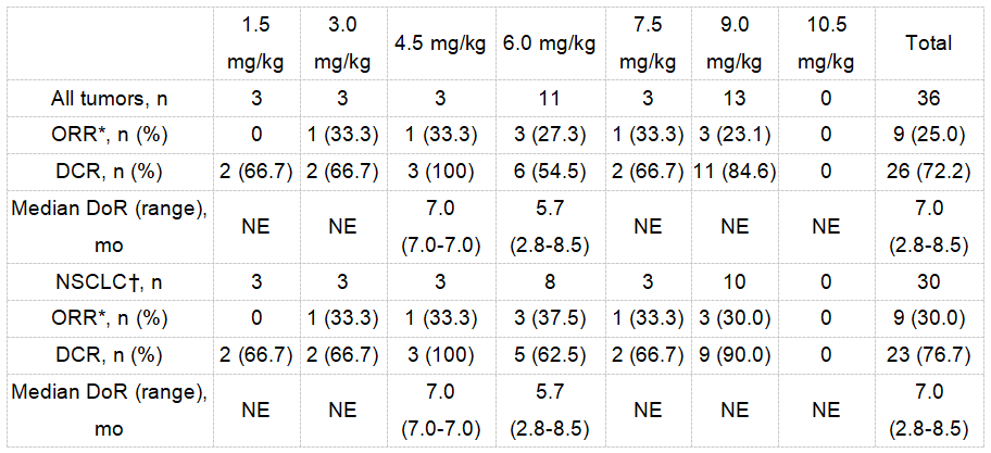 本项研究结果显示,在所有的肿瘤中,有效率(ORR)达到25%,中位持续缓解时间达(DoR)7个月,在多线治疗后的非小细胞肺癌中,ORR可以达到30%,如此结果令人非常期待,为我们扩展临床试验奠定了非常好的基础。此项Ⅰ期试验的PK(Pharmacokinetic,药代动力学)等数据也均在合理范围内,也支持我们用9 mg的剂量进一步开展Ⅱ期临床试验。