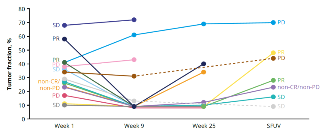 27名患者中有15名在第1周有可量化的TF(tumor fraction),范围为10%-68%,并且在第9周可以评估TF的变化。在这15名患者中,10名患者出现TF BLQ(10%),1名患者TF下降≥50%,4名患者在第9周时TF无变化(变化<50%)。4/4的PR患者、2/2的非CR或非PD患者、3/5的SD患者(额外的一名患者减少≥50%)和1/4的PD患者在第9周BLQ(below the limit of quantification)减少。