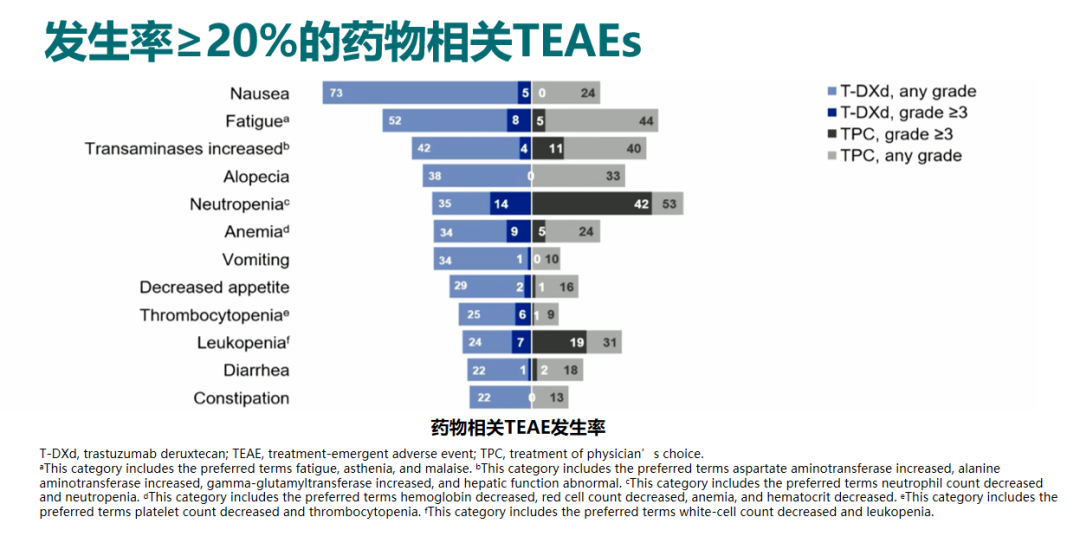 T-DXd组和TPC组的中位持续治疗时间分别为8.2个月和3.5个月。T-DXd组的≥3级治疗期间不良事件(TEAEs)发生率低于TPC组(54.4%vs 67.4%);导致减剂量的TEAEs发生率同样低于TPC组(24.0%vs 37.8%),且T-DXd组常见的减剂量TEAEs为恶心(4.6%)和血小板计数减少(3.0%),而TPC组为中性粒细胞计数减少(10.5%)和手足综合征(5.2%)。
