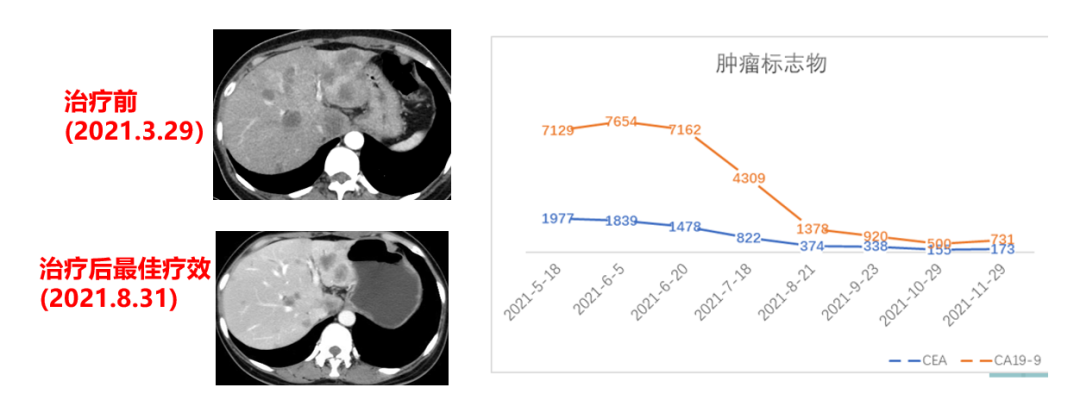 于2021.04.17行“FOLFOX6”方案化疗1周期,行“奥沙利铂”化疗时,出现严重过敏。因患者基因状态为RAS,BRAF野生型,第2周期始给予“FOLFIRI+西妥昔单抗”,在治疗过程中,肿瘤标志物持续下降,影像学也显示肝脏病灶明显缩小。疗效评价PR,在2021-09-25在局麻DSA下行“肝动脉造影并化疗灌注栓塞术”。