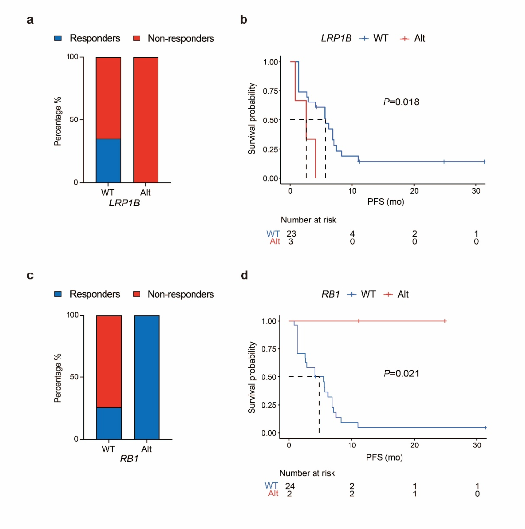 基因组进一步分析结果显示,3例携带LRP1B基因突变的患者对治疗未应答,而具有LRP1B基因野生型的患者中有30%(7/23)出现肿瘤缓解(图3a)。LRP1B基因突变的患者相较于LRP1B基因野生型的患者相比PFS显著较短,2.8个月vs.6.9个月,P=0.018(图3b)。2例RB1基因突变的患者对治疗均反应,1例CR,1例PR,RB1基因野生型的患者中有26%(7/27)对治疗有反应(图3c)。RB1基因突变的患者和RB1基因野生型的患者PFS无显著差异(图3d)。此外,在具有突变和野生型TP53、MLL3、PIK3CA和DNMT3A基因的患者中,中位PFS没有显著差异。