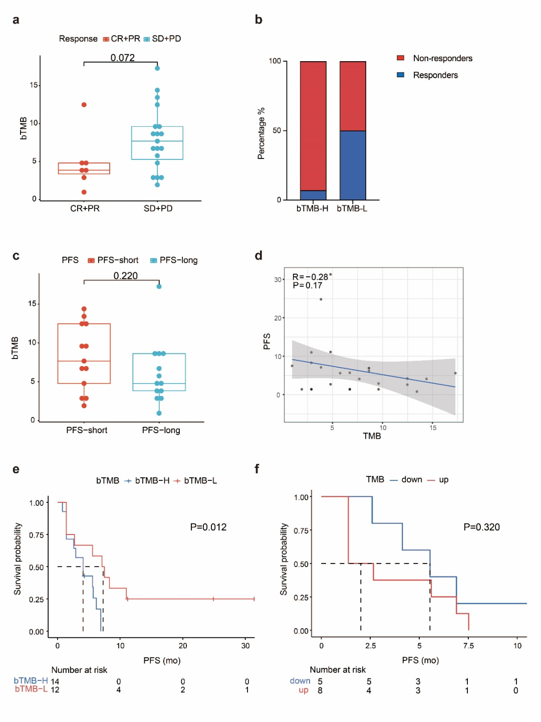 目前,关于bTMB(血液TMB)与抗血管生成治疗联合免疫治疗在TNBC患者中的治疗反应之间的关系暂时没有数据支持。我们对于bTMB是否可以作为预测复发或转移性TNBC患者治疗反应的生物标志物做了进一步分析。26名患者有基线bTMB数据,中位数为6.7Muts/Mb,对安罗替尼+贝莫苏拜单抗有反应的患者的中位数TMB相较于无反应的患者低,但差异并不明显,3.8 Muts/Mb vs.7.7 Muts/Mb,P=0.072(图4a)。使用中位数TMB将患者分为bTMB-H和bTMB-L组,bTMB-L组对安罗替尼+贝莫苏拜单抗显示出客观反应的比例较高,而bTMB-H组较低50%vs.7%(图4b)。PFS-short(<4.9个月)的患者的中位数bTMB略高于PFS-long(≥4.9个月)的患者,7.68 Muts/Mb vs.4.8 Muts/Mb,P=0.220(图4c)。Spearman相关性分析显示PFS与bTMB呈弱负相关,r=-0.28,P=0.17(图4d)。bTMB-L患者的mPFS显著长于bTMB-H患者,7.3个月vs.4.1个月,P=0.012(图4e)。13名患者在基线和PD时均有血浆DNA数据,其中5名患者的bTMB减少,bTMB下降的患者的mPFS略长,无统计学差异,6.3个月vs.4.2个月,P=0.320(图4f)。