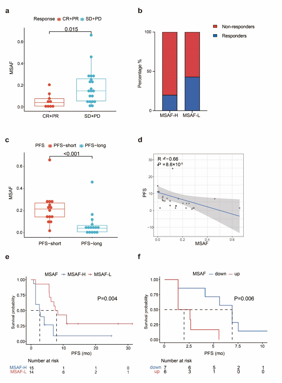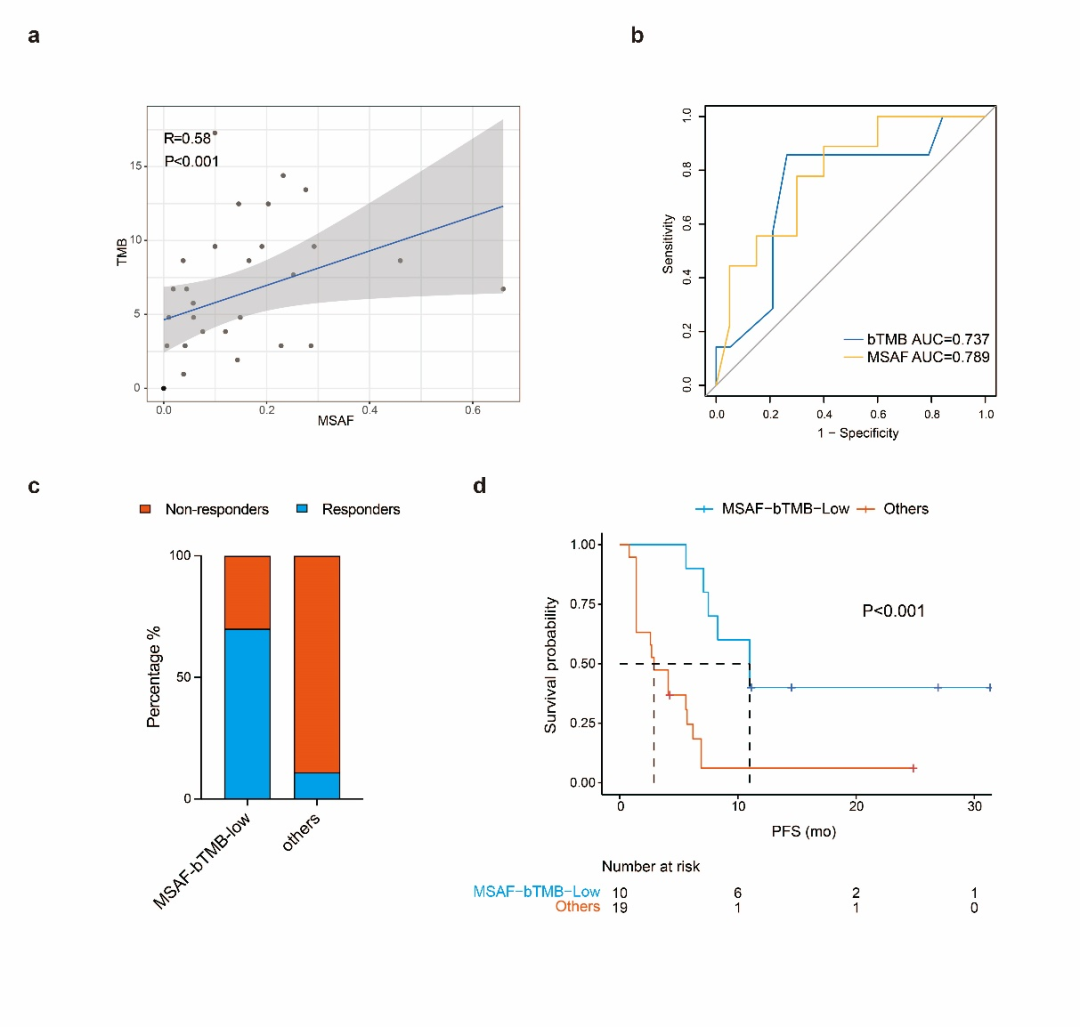 Spearman相关性分析显示bTMB与MSAF存在显著正相关关系,r=0.58,P<0.001(图6a)。对于客观反应,MSAF的曲线下面积(AUC)为0.79,而bTMB的AUC为0.74(图6b)。10名患者具有MSAF-bTMB-L中,有7例对安罗替尼+贝莫苏拜单抗联合治疗显示出客观反应,其他情况的患者中只有2例对该组合有客观反应,70%vs.11%,P<0.001(图6c)。MSAF-bTMB-L患者mPFS显著高于其他患者,11.0个月vs.2.9个月,P<0.001(图6d)。