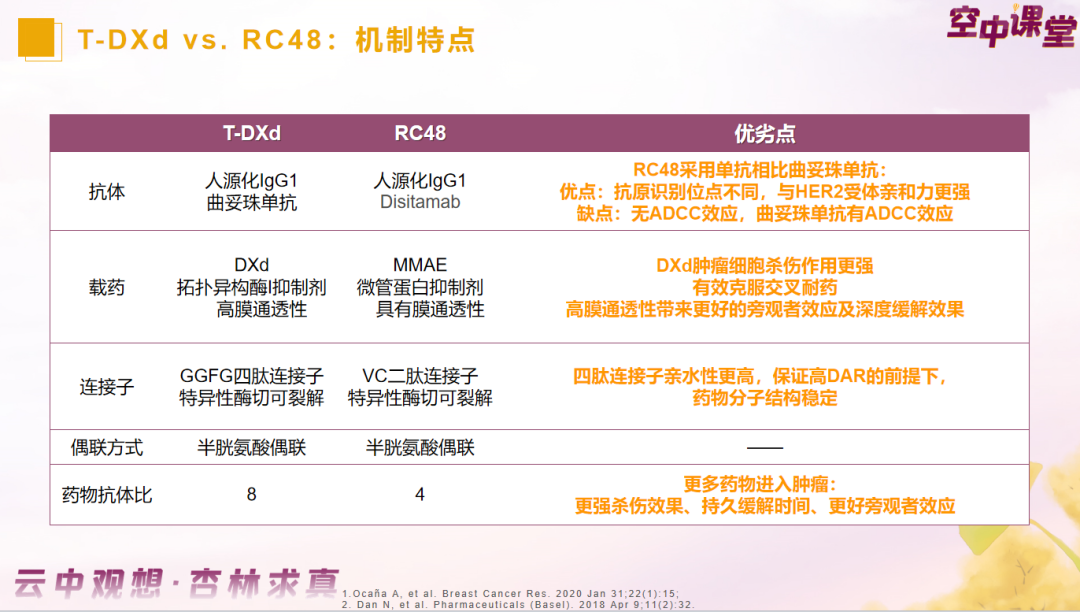 尽管RC48在治疗HER2低表达mBC中展现了积极的抗肿瘤活性,但其与T-DXd在药物机制方面有一定差异:(1)T-DXd的抗体部分曲妥珠单抗保留了与裸抗相似的HER2结合亲和力,而且具有ADCC效应;而RC48抗体部分Hertuzmab与HER2亲和力更强,但没有很好的ADCC效应[27-28]。(2)T-DXd的DAR是RC48的两倍,高DAR能在更广泛的HER2表达水平,尤其是HER2低表达、超低表达肿瘤中仍具有抗肿瘤效果,有研究显示在HER2弱阳性细胞系中,DAR=8的ADC表现出相较于DAR=3.4的ADC所不具有的抗肿瘤作用[29]。(3)T-DXd的载药DXd具有更强的肿瘤细胞杀伤作用,并且可以克服乳腺癌常见化疗药物的交叉耐药,其高膜通透性带来更好的旁观者效应及更优的疗效。(4)二者连接子均可裂解,在稳定性和均一性前提下,DAR越高的ADC疗效越好,T-DXd四肽连接子亲水性更高,保证高DAR的前提下,药物分子结构稳定[30-31]