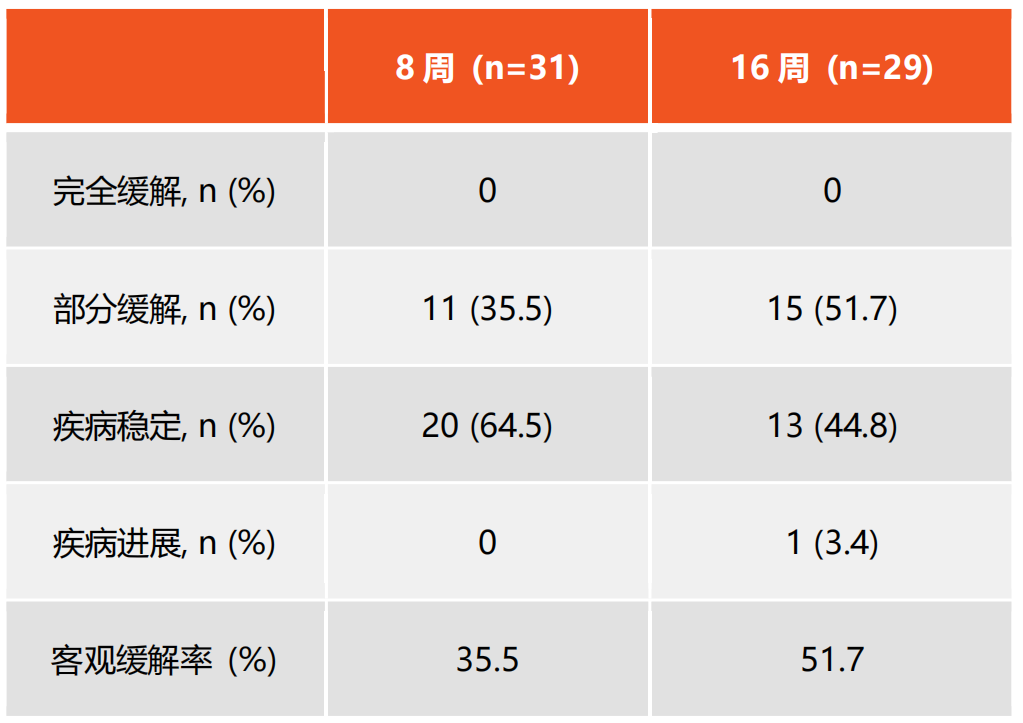 在所有35例患者中,最常见的副作用是中性粒细胞减少(74.3%)、白细胞减少(68.6%)、贫血(34.3%)和疲劳(31.4%)。而最常见的3级或以上不良事件是中性粒细胞减少(45.7%)。期间未发生热性中性粒细胞减少症或与治疗有关的死亡事件。