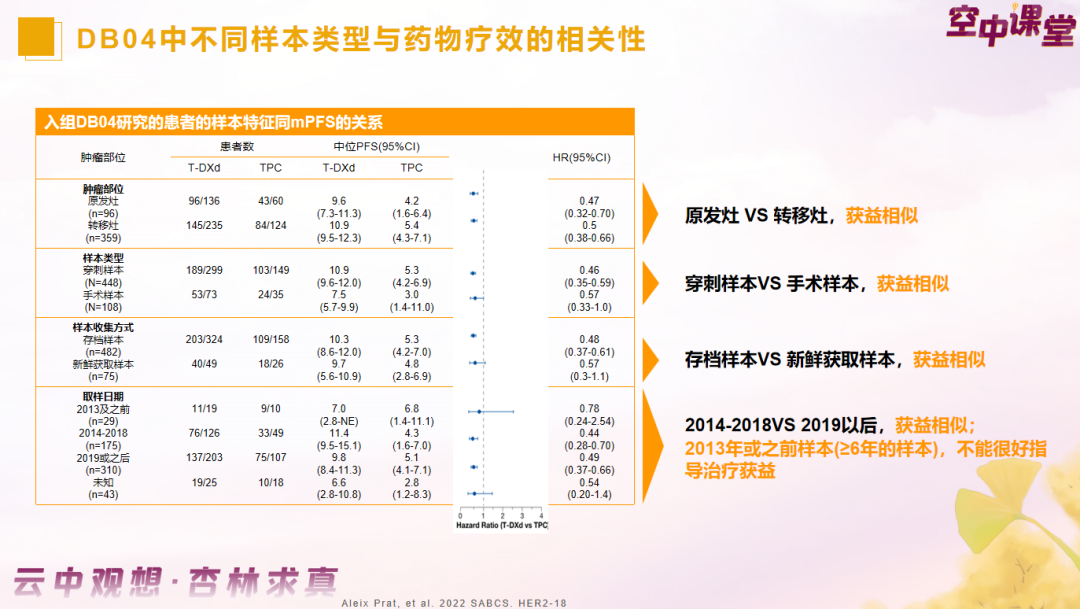 值得注意的是,对DB-04研究的肿瘤样本分析[25]显示,无论是原发灶vs转移灶、穿刺样本vs手术样本、存档样本vs新鲜样本、2014-2018年的样本vs 2018年以后的样本,均显示T-DXd治疗有一致的PFS获益。这表明,在这些可能影响HER2低表达异质性的各种因素下,T-DXd治疗能够保持稳定的治疗获益。
