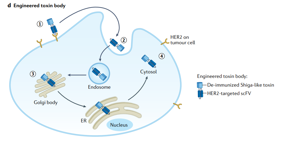 工程毒素体(ETBs)是一种结合了抗体特异性和细菌毒素细胞破坏机制的新型免疫毒素(图6)。MT-5111将去免疫ETB融合到HER2抗体产生了新的作用机制,通过酶促作用和永久性核糖体破坏作用直接杀伤细胞,从而潜在地绕过抗HER2 TKIs、ADC或抗体等的耐药机制[9]