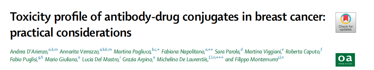 D’Arienzo A,Verrazzo A,Pagliuca M,Napolitano F,Parola S,Viggiani M,Caputo R,Puglisi F,Giuliano M,Del Mastro L,Arpino G,De Laurentiis M,Montemurro F.Toxicity profile of antibody-drug conjugates in breast cancer:practical considerations.EClinicalMedicine.2023 Jul 27;62:102113.doi:10.1016/j.eclinm.2023.102113.PMID:37554126;PMCID:PMC10404866.