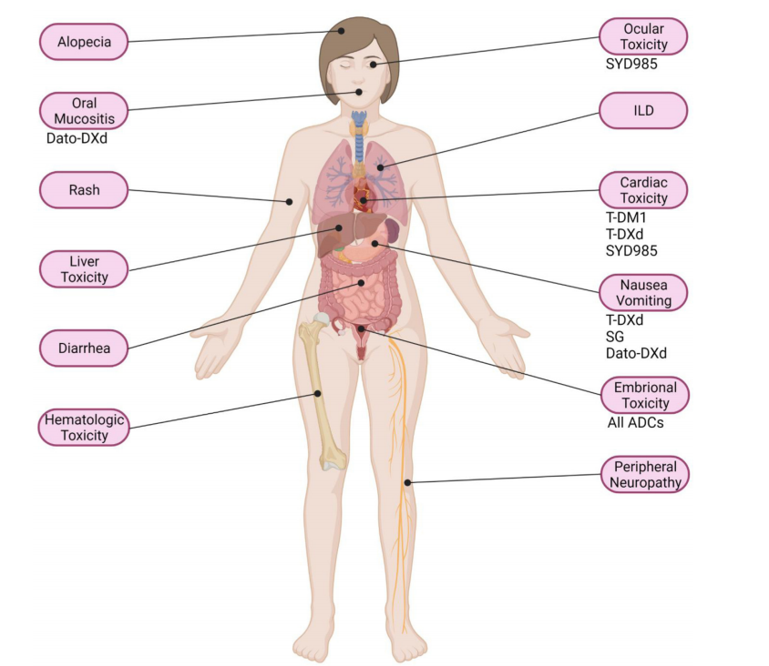 ADC由单克隆抗体与细胞毒药物通过连接子共价结合而成,可向肿瘤细胞精准递送细胞毒性化合物,显著降低细胞毒药物全身暴露及相关毒性的风险,兼具靶向与细胞毒双重效果1。目前,乳腺癌中获批的ADC主要针对人表皮生长因子受体-2(HER2)和滋养层细胞表面抗原2(Trop2)两个靶点,包括靶向HER2的恩美曲妥珠单抗(T-DM1)、德曲妥珠单抗(T-DXd)以及靶向Trop2的戈沙妥珠单抗(SG)2。此外,还有SYD985、Dato-DXd、HER3-DXd等ADC仍在开发中。尽管ADC的药物设计具有高选择性,但治疗相关的不良事件难以避免。一项纳入169项试验、涵盖不同肿瘤类型的荟萃分析显示,ADC治疗期间不良事件的总发生率高达91.2%,包括但不限于中性粒细胞减少症、恶心呕吐、脱发、腹泻、左心室功能障碍以及ILD/肺炎等。ADC≥3级事件发生率为46.1%,不良事件导致治疗中断比例为13.2%,不良反应导致死亡发生率为1.3%。此类不良事件与ADC的有效载荷释放、连接子的稳定性、内化过程相关3。ADC治疗BC期间可能发生的毒性反应如下图4