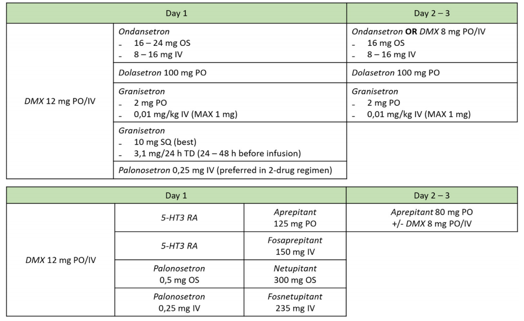 下图呈现了恶心呕吐的预防方案。然而预防后也可能出现突破性恶心呕吐,此时则进一步升级恶心呕吐处理措施,可选药物包括地塞米松、甲氧氯普胺、奥氮平等。