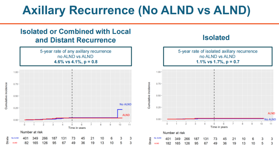 EUBREAST-14R研究结果表明,NAC后SLN残留负荷较低的患者可豁免ALND,不影响抗肿瘤治疗的安全性,5年腋窝复发率没有显著差异(4.6%vs 4.1%,P=0.8)。值得一提的是,欧洲地区对于区域淋巴结放疗较为积极,因此该研究的区域淋巴结放疗比例超过80%。在此前提之下,研究者进一步提出了假设,即在豁免ALND的基础上,是否能够有选择性的豁免放疗,让患者的降阶梯治疗更加彻底,我们拭目以待。