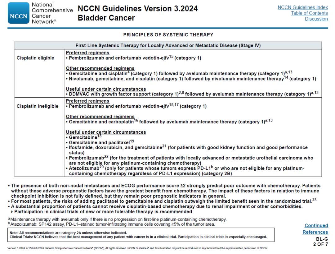 2024年V3版NCCN膀胱癌指南一线系统治疗推荐