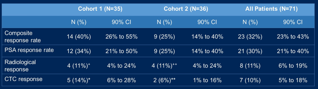 C1组的CRR为14/35(40%,90%CI:26-55%),C2组为9/36(25%,90%CI:14-40%)。研究中所有患者的CRR为23/71(32%,90%CI:23-43%)。