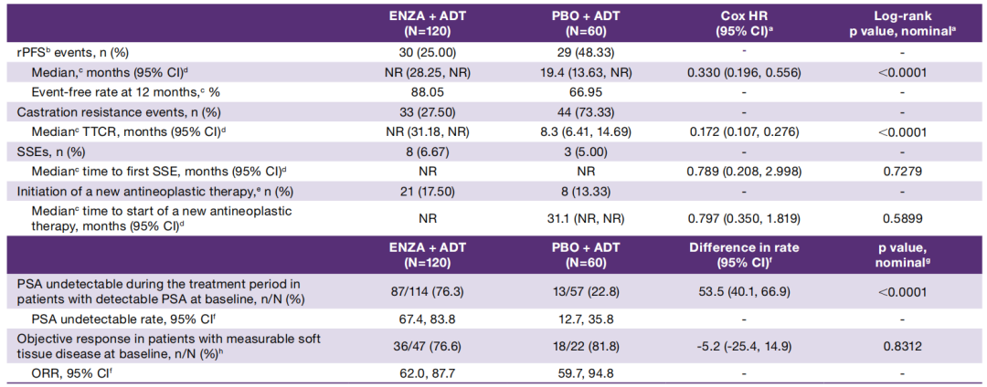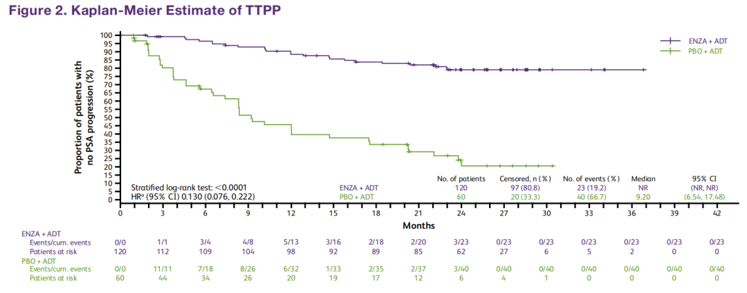 China ARCHES是一项在中国开展的多中心、双盲、随机对照3期研究,在全国27个中心纳入了180例mHSPC患者,随机(2:1)接受恩扎卢胺+ADT或安慰剂+ADT治疗,主要终点是至PSA进展时间(TTPP),次要终点包括rPFS、至去势抵抗时间(TTCR)、ORR等。研究结果显示达到了主要终点,恩扎卢胺组的PSA进展风险显著降低87%(TTPP:HR 0.130,P<0.0001);而rPFS(NR vs 19.4个月,HR 0.330,P<0.001)、TTCR(NR vs 8.3个月,HR 0.172,P<0.001)等次要终点也有显著改善。总的来说,这是一个获得阳性结果的3期试验,显示了非常具有临床意义的积极结果。